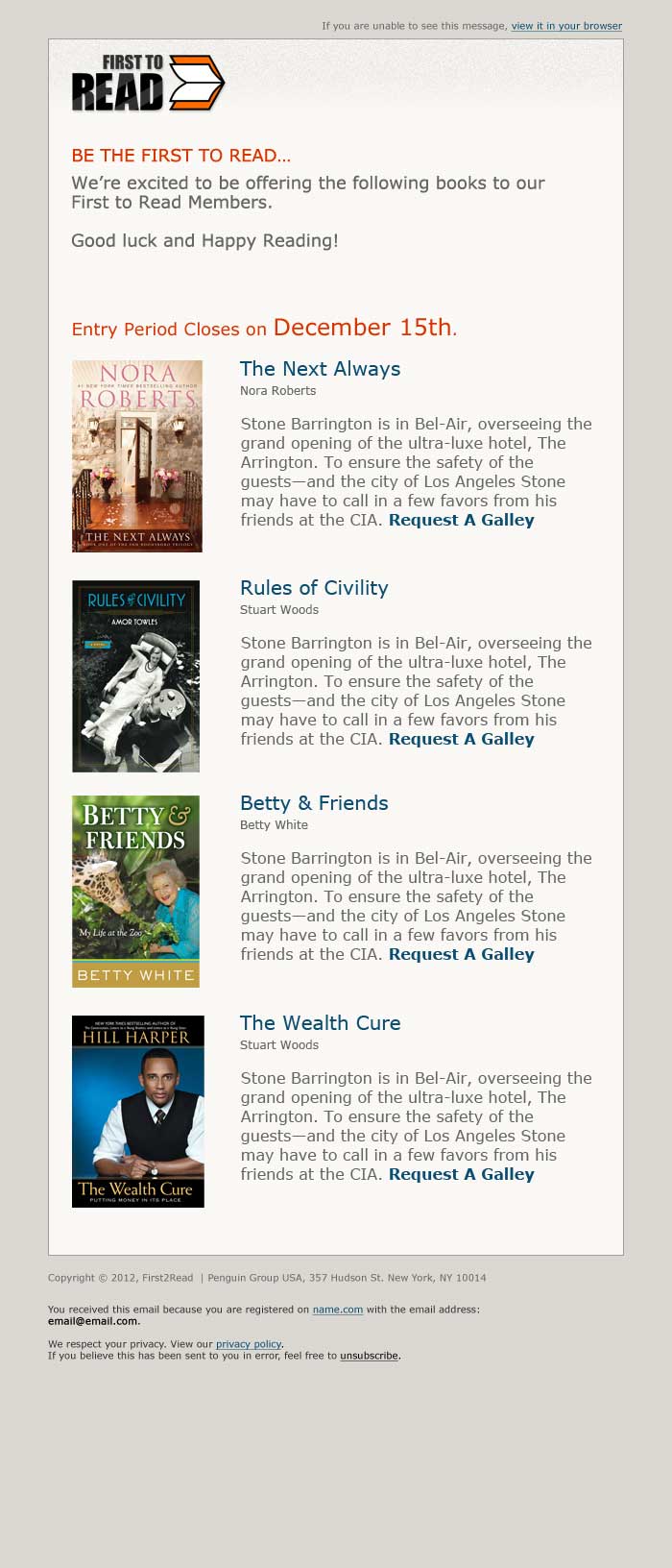 First to ReadWebsite Penguin’s First to Read program is an early access lottery for avid readers. Members earn additional entries based on social engagement and book reviews.Monthly emails recommend soon-to-be published titles based on user preferences and ratings of previous titles. UX and IA Visual Design Logo Design